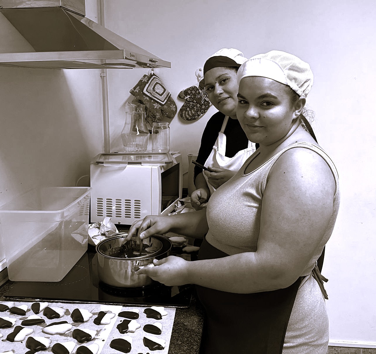 A Oficina de Bolachas é constituído por um grupo pequeno de mulheres, que após um período de 6 meses de formação, aprendeu a confecionar bolachas a partir de receitas para a autonomia. As bolachas apresentam-se numa embalagem pensada pelas participantes, fechado por um laço costurado pela Oficina de Costura onde entre o treeee das máquinas também se aprende a costurar.